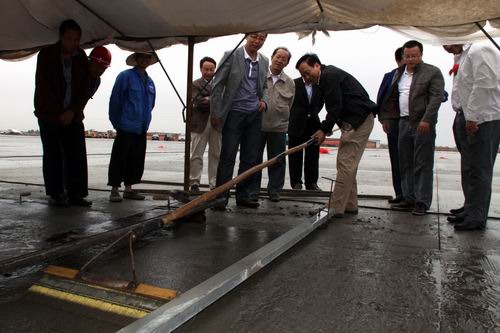 由公司承建的金昌機(jī)場停機(jī)坪工程按4C標(biāo)準(zhǔn)設(shè)計(jì),站坪機(jī)位4個(2B2C),總面積2.65萬平方米,可供波音737和空客320等機(jī)型的起降。該項(xiàng)工程自2009年10月進(jìn)場,公司金昌機(jī)場項(xiàng)目部全體人員在高溫酷暑、大風(fēng)揚(yáng)沙等惡劣氣候條件下,克服種種困難,通過改進(jìn)施工工藝、調(diào)整作業(yè)時間等措施,順利完成了基礎(chǔ)施工。項(xiàng)目部僅用了25個晝夜就完成停機(jī)坪2.65萬平方米混凝土道面工程施工。