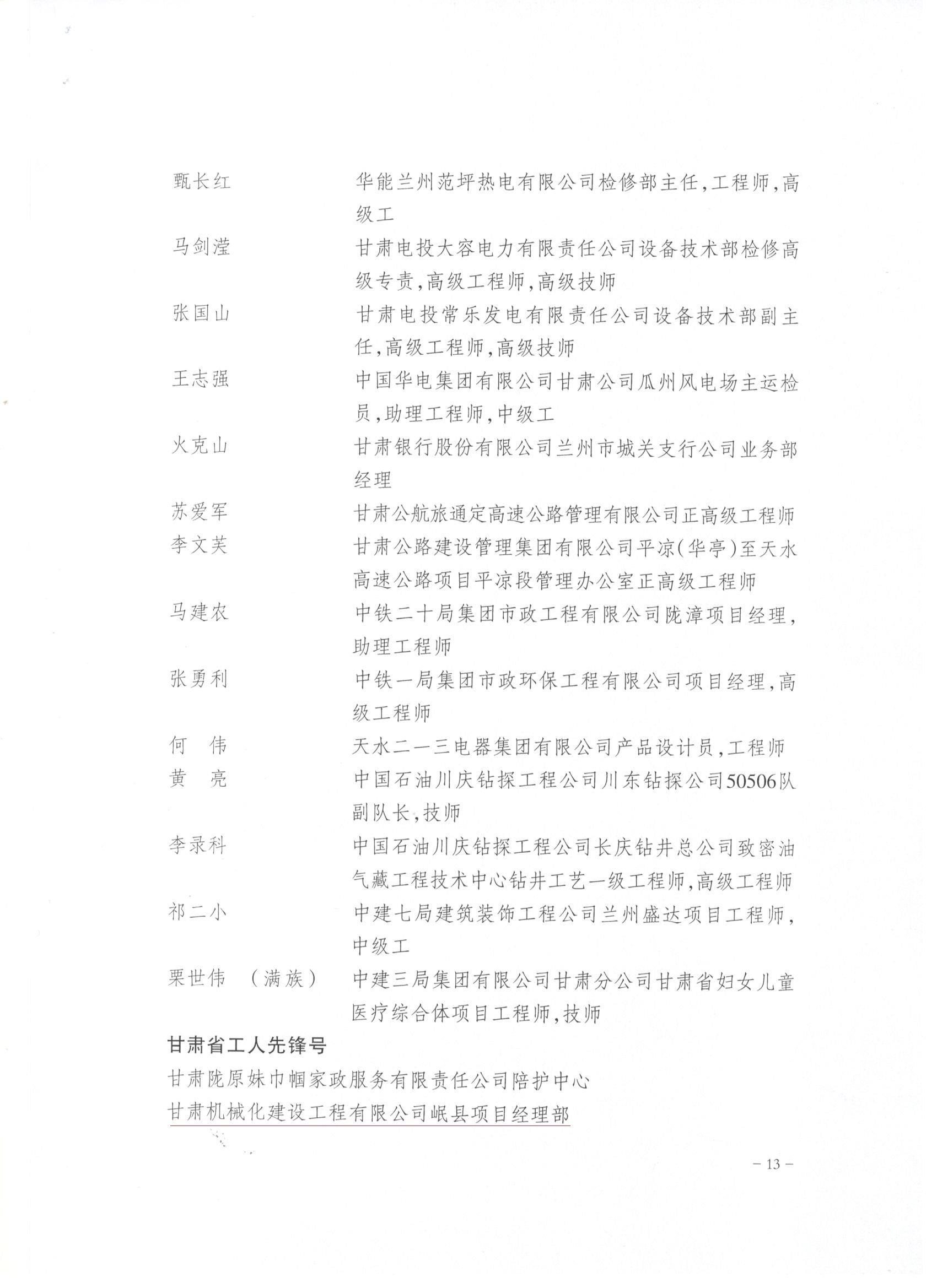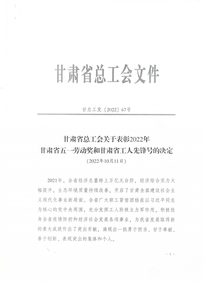近日,甘肅省總工會發(fā)布了《關(guān)于表彰2022年甘肅省五一勞動獎和甘肅省工人先鋒號的決定》,我司被授予“甘肅省五一勞動獎”和“甘肅省工人先鋒號”。