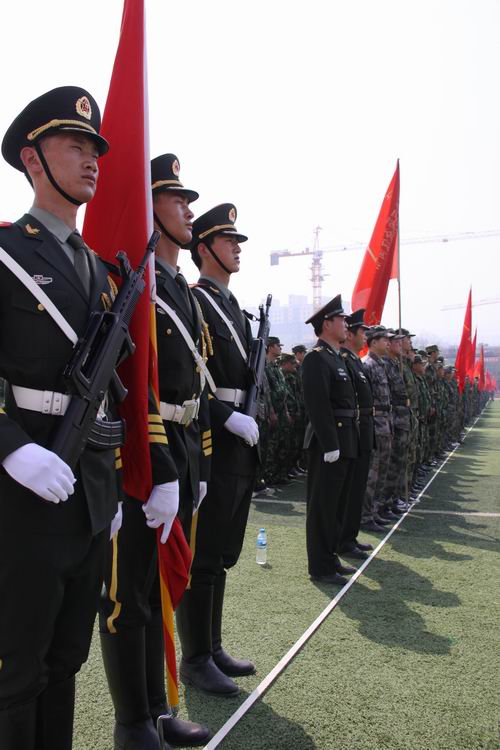 上午10時(shí),點(diǎn)驗(yàn)大會(huì)在嘹亮的軍歌聲中拉開序幕。預(yù)備役官兵軍容嚴(yán)整,雄姿勃發(fā),精神抖擻,士氣高昂,充分展示了當(dāng)代預(yù)備役軍人的良好精神風(fēng)貌,展現(xiàn)了部隊(duì)良好的軍政素質(zhì)和優(yōu)良的戰(zhàn)斗作風(fēng)。3名儀仗隊(duì)員護(hù)衛(wèi)著軍旗,邁著矯健的步伐從主席臺(tái)南側(cè)走到隊(duì)列北側(cè)。1500余人的預(yù)備役軍人身著整齊的軍裝,按照各自編制,在操場(chǎng)排成整齊的方隊(duì),接受了首長(zhǎng)的檢驗(yàn)并進(jìn)行了宣誓儀式。點(diǎn)驗(yàn)結(jié)束后,預(yù)備役官兵進(jìn)行了擒敵拳、盾牌警棍術(shù)和防爆隊(duì)形等三個(gè)科目的匯報(bào)演示。通過集結(jié)點(diǎn)驗(yàn),鍛煉提高了團(tuán)首長(zhǎng)機(jī)關(guān)和營(yíng)連各級(jí)指揮員的組織協(xié)調(diào)能力,探索研究了組織全團(tuán)集結(jié)點(diǎn)驗(yàn)的方法路子,錘煉了部隊(duì),強(qiáng)化了作風(fēng),有效提高了部隊(duì)快速動(dòng)員和隨時(shí)應(yīng)召的能力。